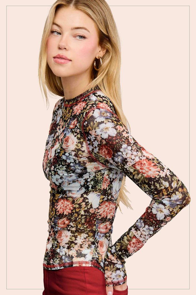 This semi sheer mesh top, adorned with a delicate floral pattern, offers a fitted silhouette with long sleeves and a crew neckline. Its stretchy fabric and exposed stitching make it comfortable and stylish for layering or wearing on its own. Lightweight and versatile, this top is an ideal addition to your wardrobe for adding subtle feminine charm throughout the year.