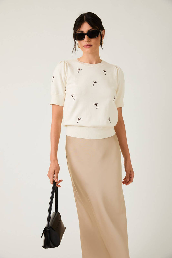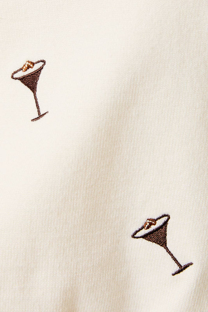 This half-sleeve knit top features charming espresso martini embroidery, perfect for adding a playful touch to your evening look. Its cozy fabric and flattering fit make it an ideal choice for a night out with friends or a special date night. Enjoy comfort and style effortlessly with this unique sweater.