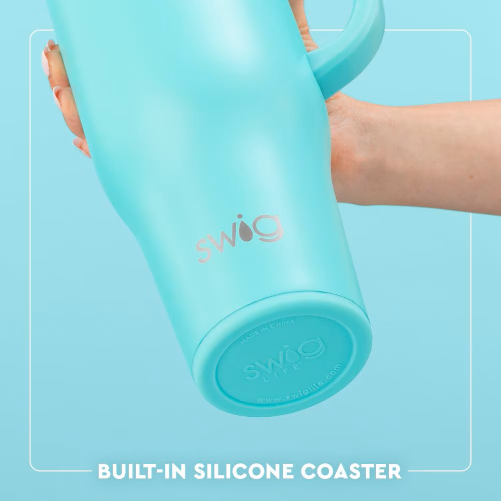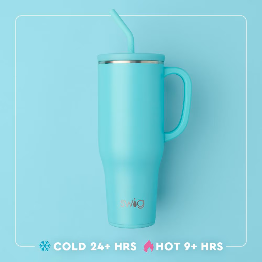 Hydrating has never been easier with our 40oz Insulated Mega Mug! A cup holder-friendly frame, a comfort-grip handle, and a plastic straw with a silicone flexi-tip all come together to create your new favorite Swig.