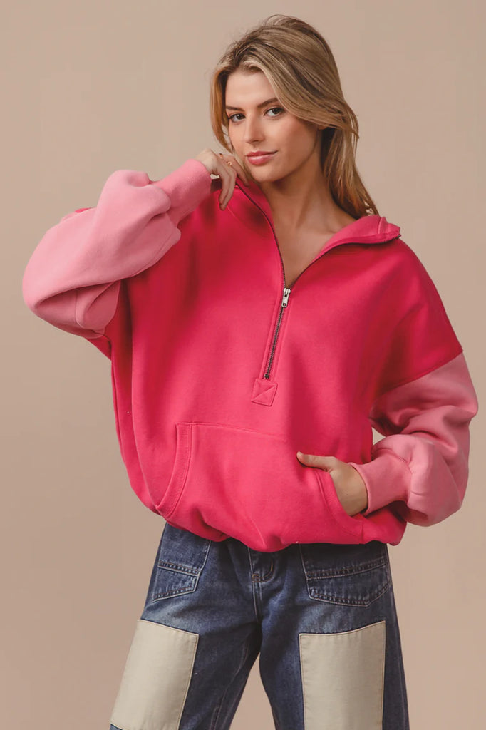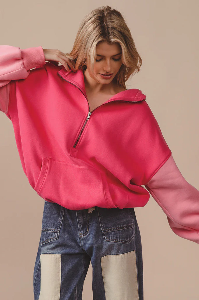 Our Color Block Fleece Hoodie is the perfect blend of comfort, style, and feel-good vibes—just in time for Valentine’s Day. Designed with a dark fuchsia fleece body and soft light pink sleeves, this hoodie features contrast stitching, a half-zip neckline, and an elastic hem for a flattering, relaxed fit.