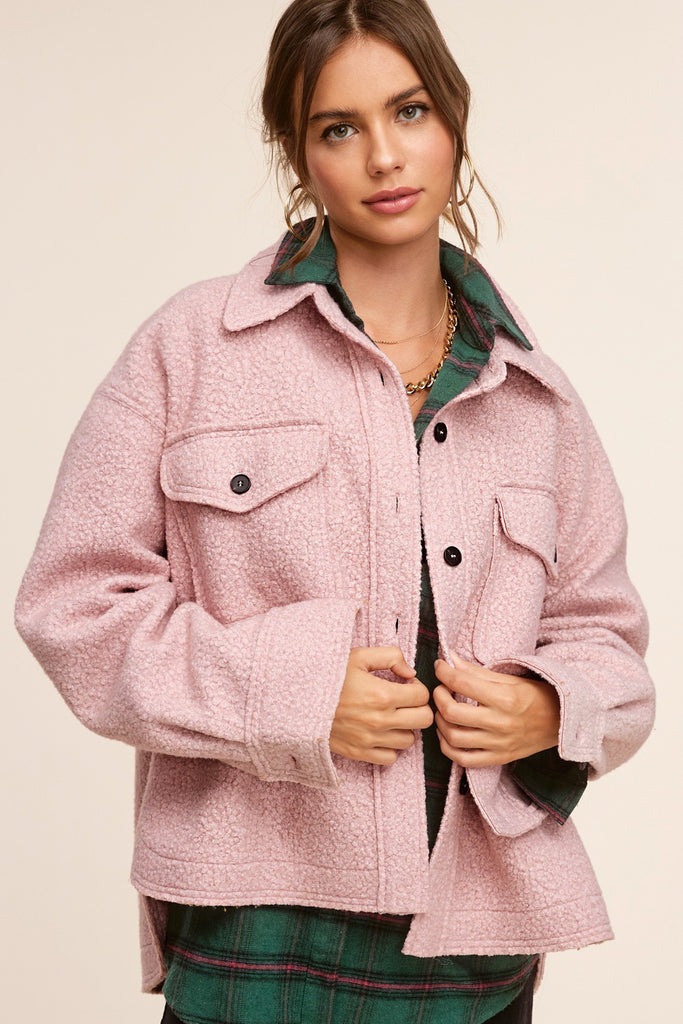 Designed with a relaxed, loose fit, this fuzzy shacket is perfect for layering over tees, tanks, or your favorite plaid shirts. The collared neckline, functional button down front, and chest pockets add a polished look while still keeping things casual and comfortable. The blush pink color brings a soft, feminine touch that pairs effortlessly with denim, leggings, or joggers.