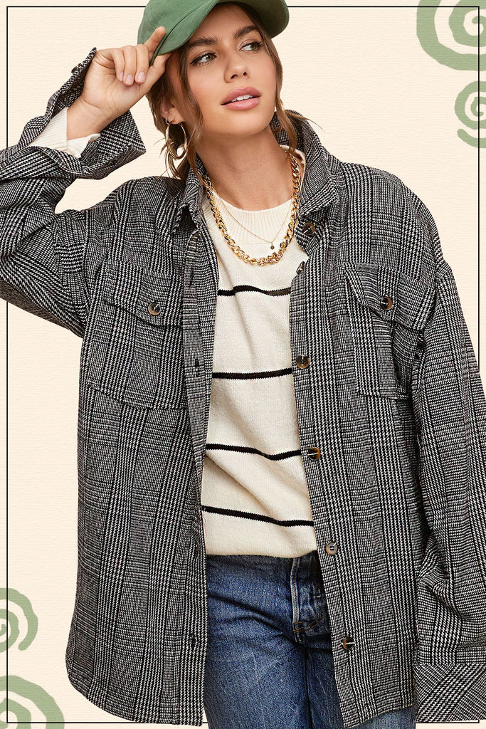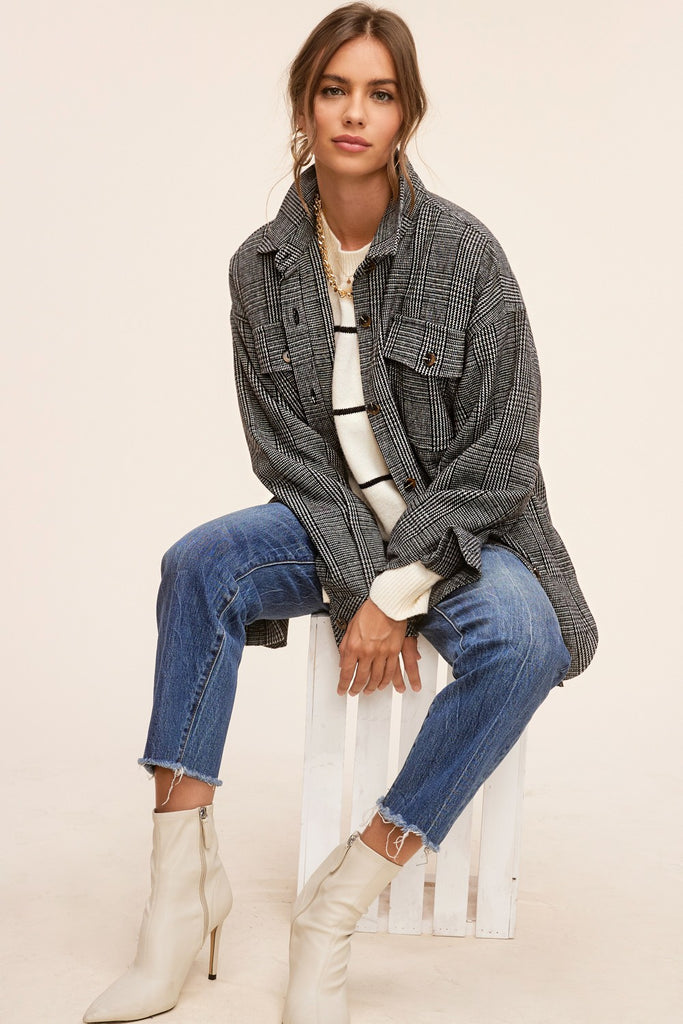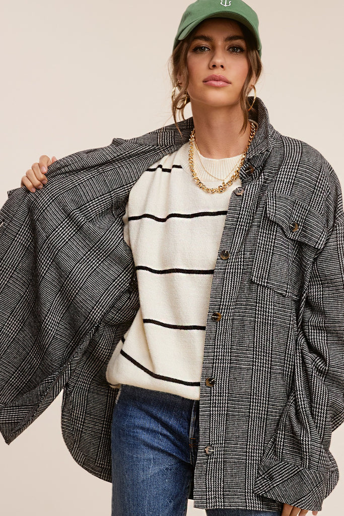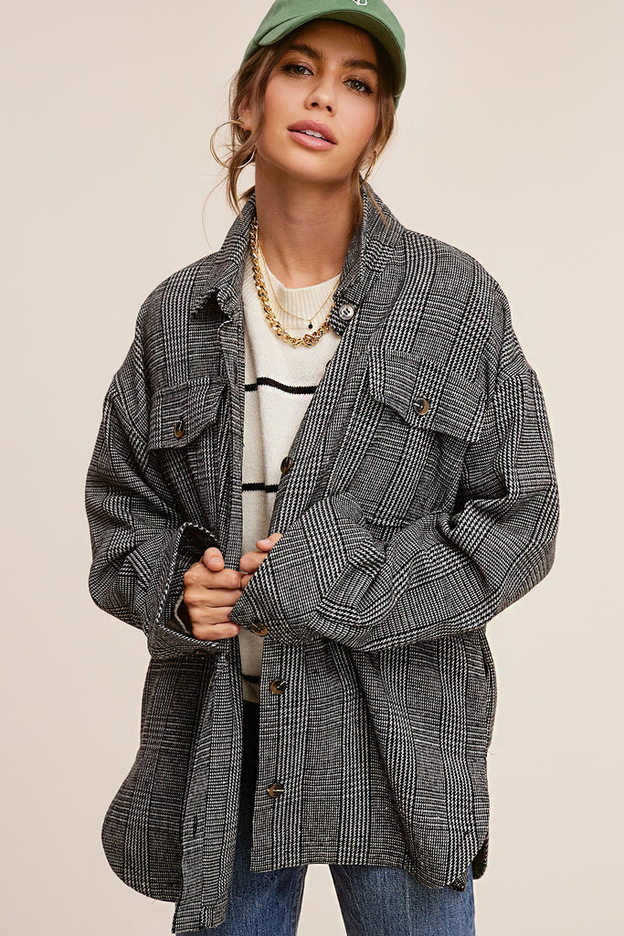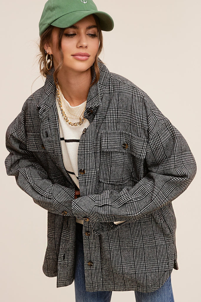 Upgrade your wardrobe with the Agatha Plaid Jacket in Black, the perfect blend of vintage charm and modern practicality. Featuring a classic plaid pattern and a relaxed, loose fit, this jacket is ideal for layering over your favorite tops, tees, or sweaters.