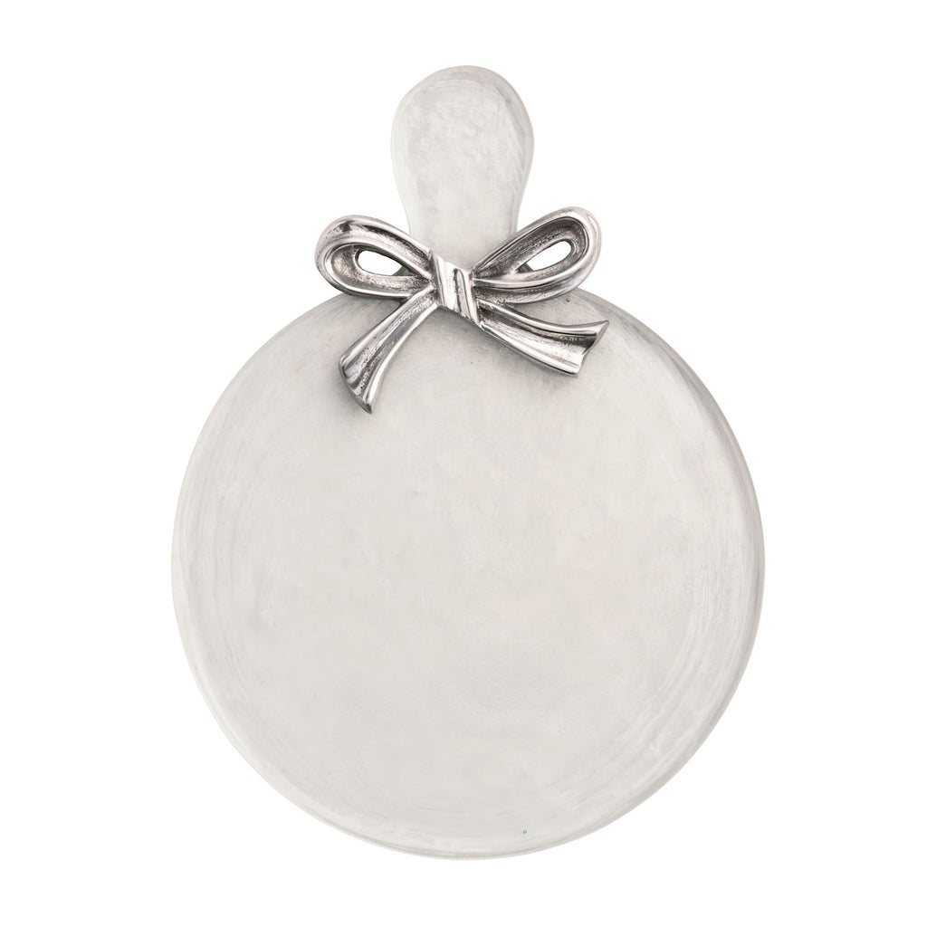 Elevate your entertaining with the Bow Glass Paddle Board, a chic and versatile serving tray designed to impress. This round glass serving board features a striking layered cast aluminum bow that adds elegance and a modern touch to any tabletop. Perfect for cheese boards, charcuterie spreads, appetizers, or desserts, this stylish tray is ideal for hosting parties, holiday gatherings, or casual get-togethers.