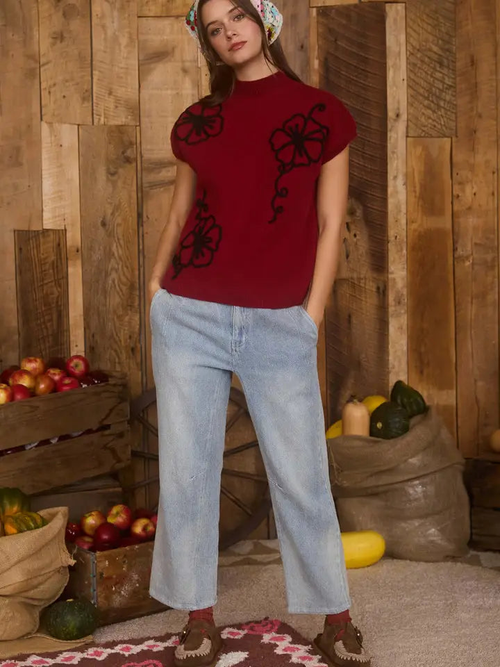 This burgundy knit sweater is perfect for casual weekends, layering over collared shirts for work, or pairing with jeans and boots for a cozy yet stylish outfit. The floral trim detail makes it stand out from your basic sweaters, while the mock neck design keeps you looking sleek and put-together.