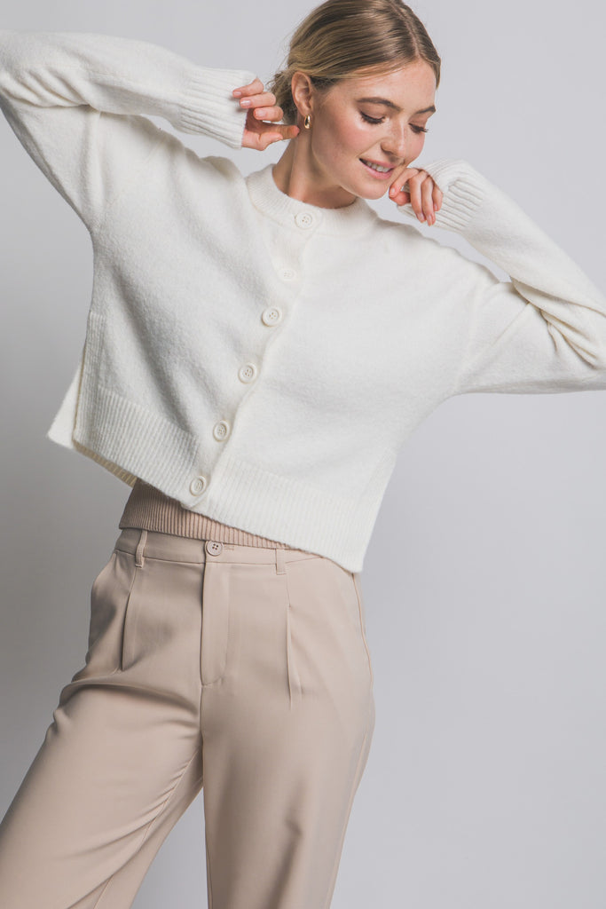 Stay cozy and chic with our Ivory Crew Neck Cardigan, designed with timeless details that make it a wardrobe staple. Featuring a classic crew neckline, button-up front closure, and subtle side slits, this cardigan is the perfect layering piece for transitioning into cooler weather.