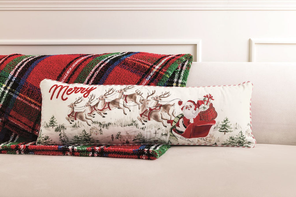 Cozy up your home for the holidays with our Santa Scene Long Pillow, the perfect festive accent for your sofa, bed, or entryway bench. This embroidered Christmas pillow features a beautifully detailed scene of Santa and his sleigh flying over snowy treetops, complete with all of his reindeer.